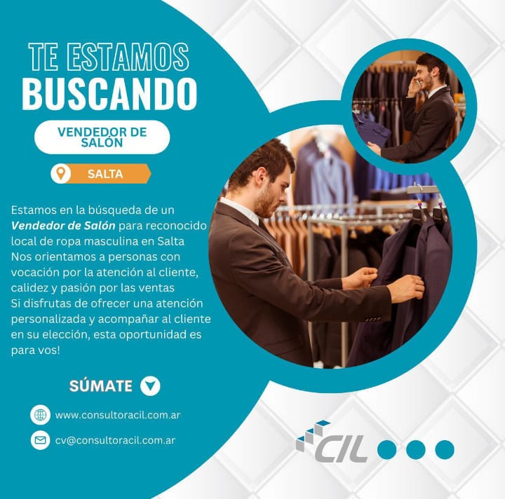 La búsqueda está dirigida a personas para trabajar en un reconocido local de ropa masculina, con vocación por la atención al cliente, calidez y pasión por las ventas.